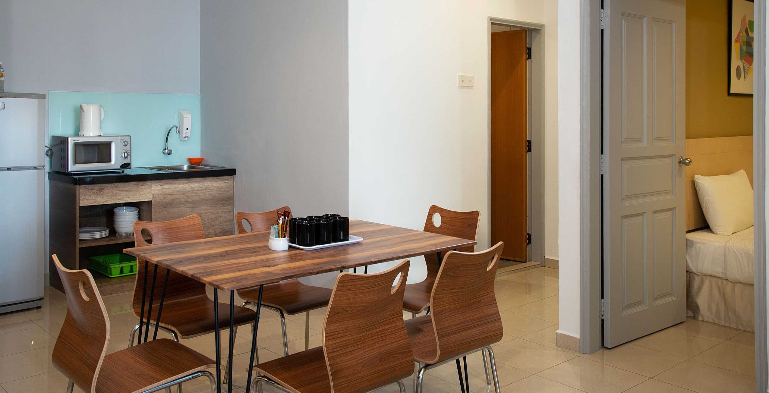 - Dapur kecil dilengkapi dengan meja makan beserta kursi makan, kulkas, microwave, teko untuk membuat teh dan kopi, peralatan makan dan perkakas dapur.